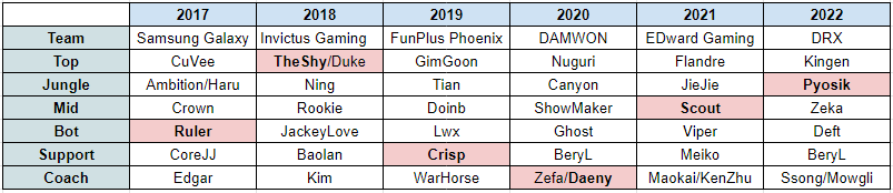 6.在此次世界赛中战胜了六个曾经的世界冠军Faker击败了六位前世界冠军,他们从2017年到2022年赢得了世界赛冠军,重新夺回了王座。他战胜了JDG Ruler (2017年冠军,SSG)、WBG “ TheShy ”(2018年冠军,iG)、WBG “ Crisp ” (2019年冠军,FPX)、WBG教练“ Daeny ”(2020 年冠军,DWG)、LNG “ Scout ”(2021 年冠军,EDG) 和 TL “ Pyosik ”(2022 年冠军,DRX)。他在 2023 年世界赛上征服了全部六人。7.距 T1 和 Faker 上次夺冠已有七年T1和Faker上一次捧起召唤师杯是在2016年,继2015年和2016年连续获胜之后,他们在2017年打进了决赛,但遭遇失败。经过漫长的岁月,他们在七年后重新夺回了王位。